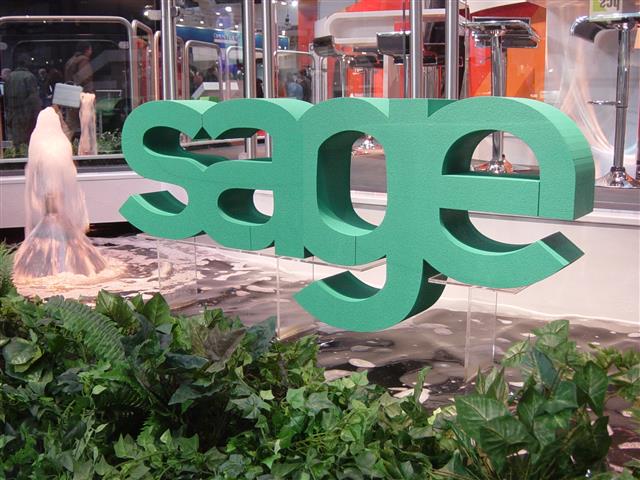 Logo "sage" - Präsentation auf der CEBIT-Computermesse in Hannover